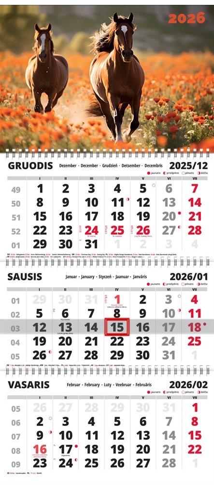 Sieninis pakabinamas kalendorius TRIPLE „Arkliai“, 310x750mm, trijų dalių, 2026 m.